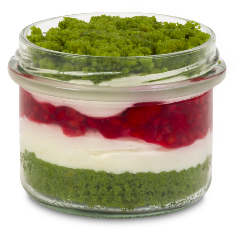 Maliny 16%, pitná voda, mascarpone (smetana, kyselina citronová), smetana, vejce, bezlepková směs (škrob (bramborový, kukuřičný, tapiokový), rýžová mouka, pohanková mouka, kukuřičná mouka, sůl, stabilizátor (E415), aroma), špenát, cukr, olej slunečnicový, citronová šťáva a kůra, jedlá soda, agar.