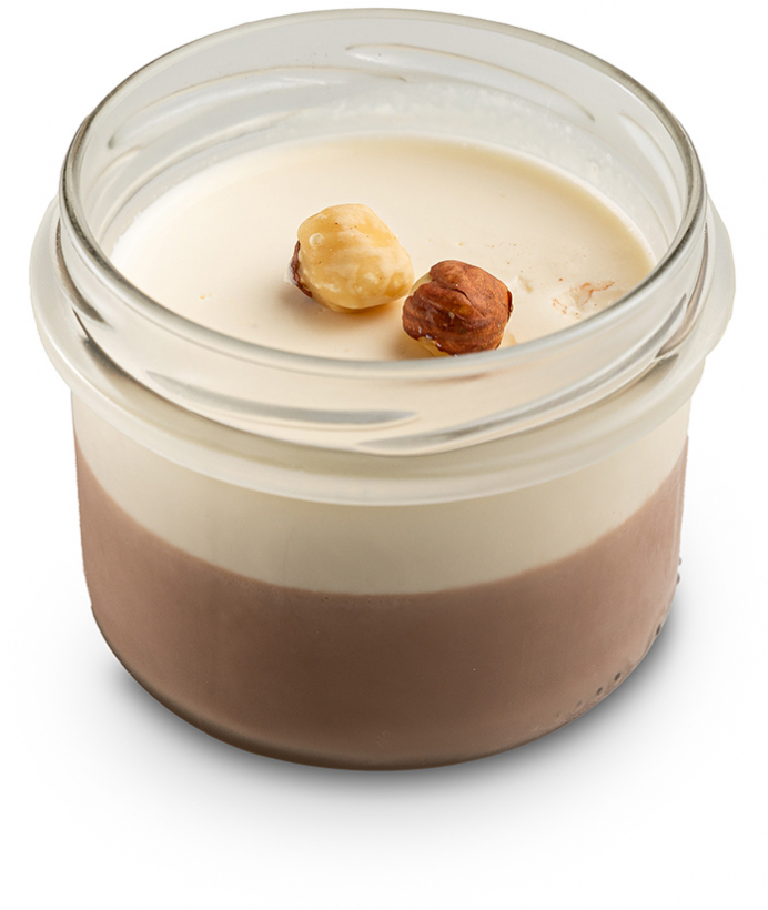 Smetana, lískooříškový krém (cukr, rostlinný tuk (shea), lískooříšková pasta 12 %, odtučněné sušené mléko, kakaový prášek se sníženým obsahem tuku, emulgátor: lecitiny (sójové), vanilin) cukr, lískové ořechy, bourbon vanilka, želatina, agar.